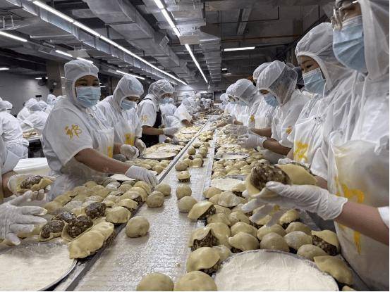 走进4万平方米的厂区,一条条工业化生产线正高效运转。从投料到出炉,一批月饼的生产周期仅需两个小时。高峰期时,这里将有近千名工人同时作业,通过“生产—包装—物流”一站式闭环,日产能最高可达40万个。